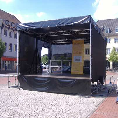 Für die kleiner gehaltene Bühnendarbietung, Promotion-Maßnahme, Kampagne oder Firmen-Veranstaltung ist unsere smartStage mit ihren 20 qm perfekt geeignet. Diese praxistaugliche Konstruktion ist nach nur 20 Minuten komplett aufgebaut und einsatzbereit. Der Auf- und Abbau bedarf bloß wenig Personalaufwand. Hiermit erlangen Sie im Nullkommanichts die Aufmerksamkeit Ihrer Gäste. Der einachsige Bühnenanhänger ist durch das geringe Eigengewicht problemlos mit einem PKW transportierbar und dient auch ideal als Technik-Podium (FOH-Platz) vor Großbühnen.